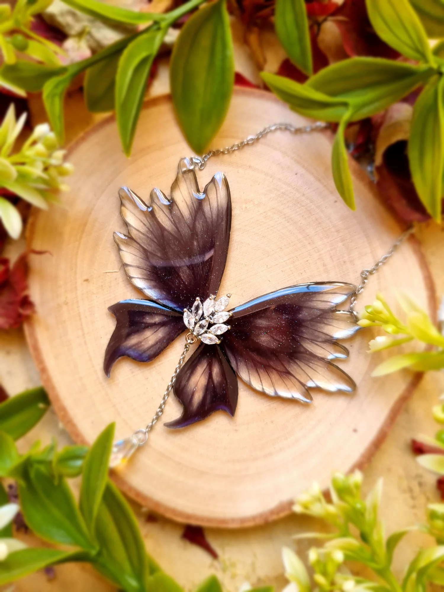 Skrzydła zrobione są z nietoksycznej żywicy epoksydowej. Łańcuszek ma długość około 42 cm i jest wykonany ze stali nierdzewnej. Ozdobny element to mosiądz zdobiony cyrkoniami.