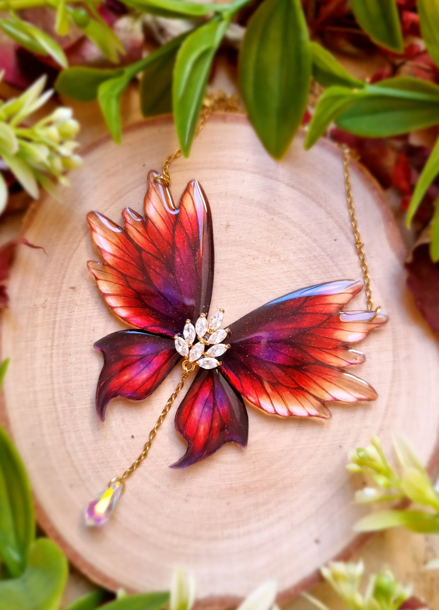 Skrzydła zrobione są z nietoksycznej żywicy epoksydowej. Łańcuszek ma długość około 42 cm i jest wykonany ze stali nierdzewnej. Ozdobny element to mosiądz zdobiony cyrkoniami.